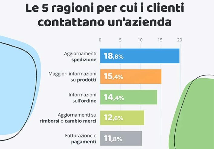 L’azienda ha svolto un’indagine per capire quali sono i primi 5 motivi per cui attualmente vengono più spesso contattate le aziende, in modo da tenerne conto anche nella scelta delle modalità e dei canali di comunicazione da mettere a disposizione dei clienti e potenziali clienti.